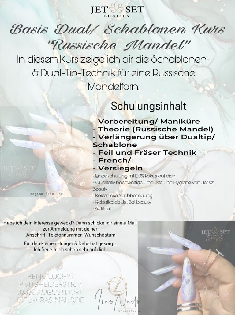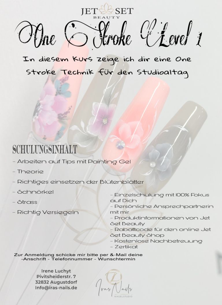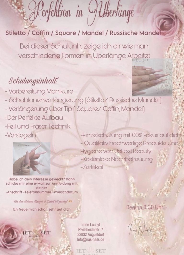 Ich berücksichtige individuelle Designwünsche und stehe dir nach den drei Schulungstagen jederzeit zur Verfügung. Zudem erhältst du einen 15%-Rabattcode für www.jet-set-store.de sowie ein Zertifikat.